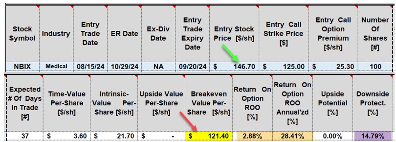 In the screenshot below, I used data from an option chain, premarket this morning. With NBIX trading at $146.70, the 9/20/2024 $125.00 strike shows a bid price (we could negotiate higher) of $25.30. Using our Trade Management Calculator (TMC), the initial 37-day time-value return is 2.88%, 28.41% annualized (brown cells- within our range) and a huge 14.79% downside protection of that time-value premium (purple cell).
