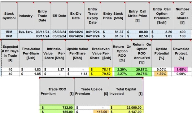 This article will highlight real-life trades using Iron Mountain Inc. (NYSE: IRM), a stock on our premium member stock watch list on 3/11/2024. We will sell 5 contracts and establish trades with both moderately bullish and bearish market assumptions.