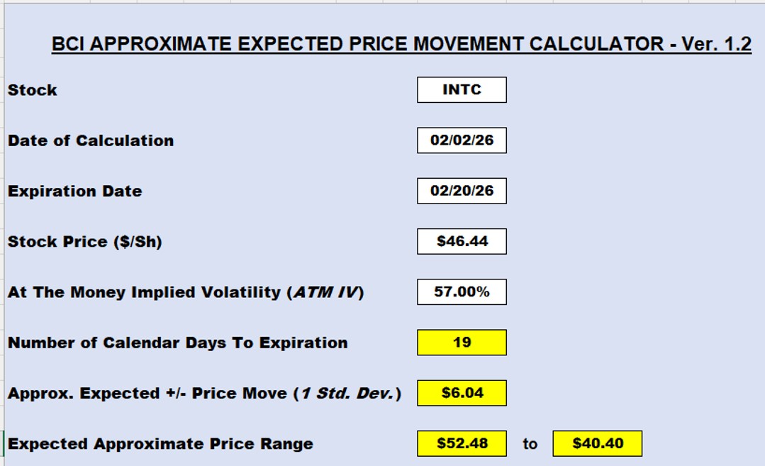 Real-life example with Intel Corp. (Nasdaq: INTC) using the BCI Expected Price Movement Calculator (ATM IV = 74%)