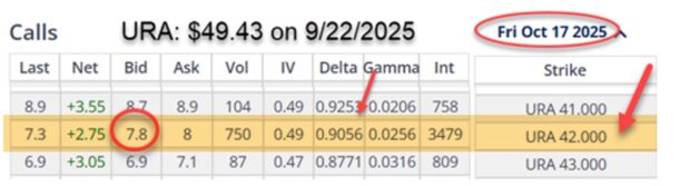 URA 1-month option chain for high Delta strikes