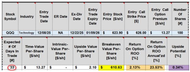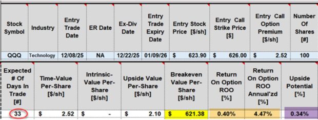 - Purple cell: 0.34% additional upside potential (if QQQ moves up to, or beyond the $626.00 strike)