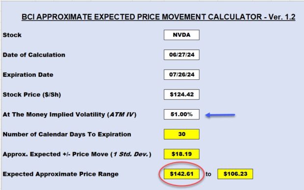 Using the BCI Expected Price Movement Calculator, we also get a low end of the range which we can use when writing deep out-of-the-money cash-secured puts or deep in-the-money covered calls. This can actually also be accomplished by using high Deltas (84%, as an example).
