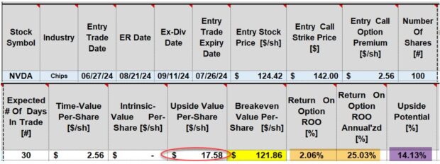 The $142.00 deep OTM strike shows a bid price of $2.56. Let’s calculate using the BCI Trade Management Calculator (TMC).