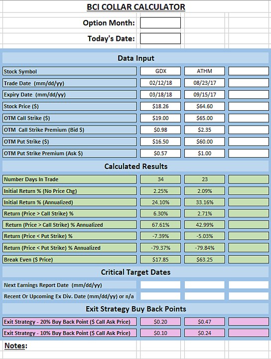 To determine the best which OTM put strike to purchase, we must first set our target initial time value returns because the strategy is based on producing cash flow. Let’s say that target is 2% for 1 month. Next, we select a combination of OTM call strikes and OTM put strikes that generate that return. Below is a screenshot of the new BCI Collar Calculator showing 2 such examples where initial returns of 2.25% (GDX) and 2.09% (ATHM) can be generated with the strikes shown in the white cells on the top of the spreadsheet.