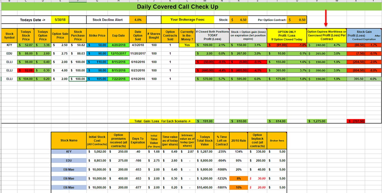 The BCI team has “tweaked” the formula in one of the cells in the “Daily Covered Call Checkup” spreadsheet. The cells impacted are titled “Option Expires Worthless or Exercised Profit (Loss) Per Contract” as shown by the red arrow below.