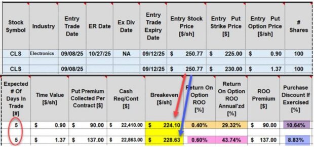 - 9/12/2025: At contract expiration, CLS closed at $241.77, down substantially from the price at trade entry but well above both OTM put strikes