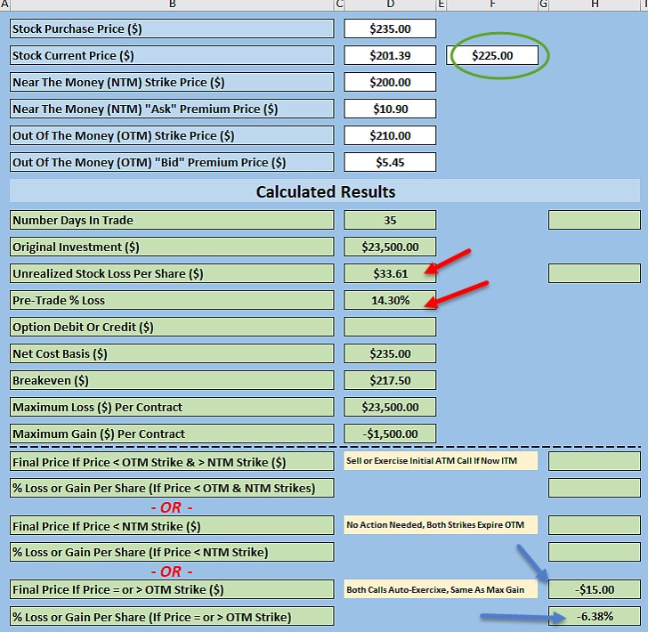 The way this stock repair trade is structured, a loss is locked in but is dramatically reduced if share price moves to $210.00 or higher by expiration. When the trade was entered (before stock repair), the loss on the stock value was $33.61