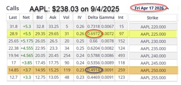 On 9/4/2025, AAPL was trading at $238.03. We will check the option-chain data for the 1-month and 6-month $225.00 (ITM) and $250.00 (OTM) strikes, as they relate to the approximate probability of expiring ITM.