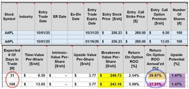 - Blue circle: The shorter-dated option has an annualized return of 29.87% (brown cell); while the longer-dated option shows an annualized return of 17.21% (pink cell)