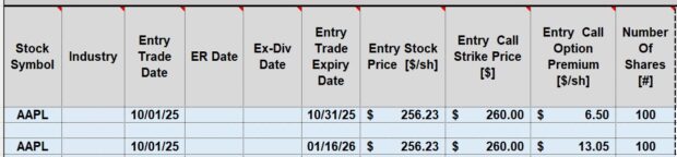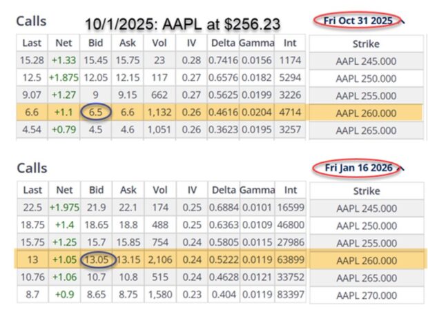 - 10/1/2025: The (1-month) 10/31/2025 $260.00 call has a bid price of $6.50